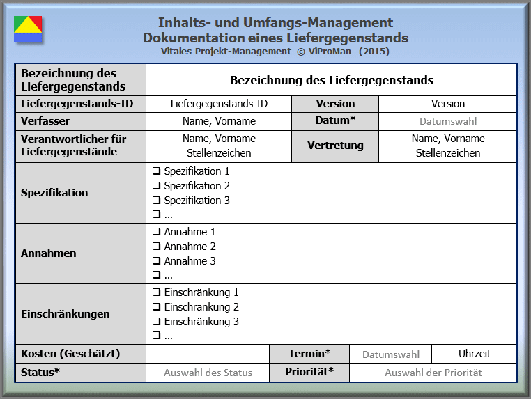 Abbildung: Erscheinungsbild der Vorlage zur Dokumentation ermittelter Liefergegenstände [ViProMan, 05.2015]