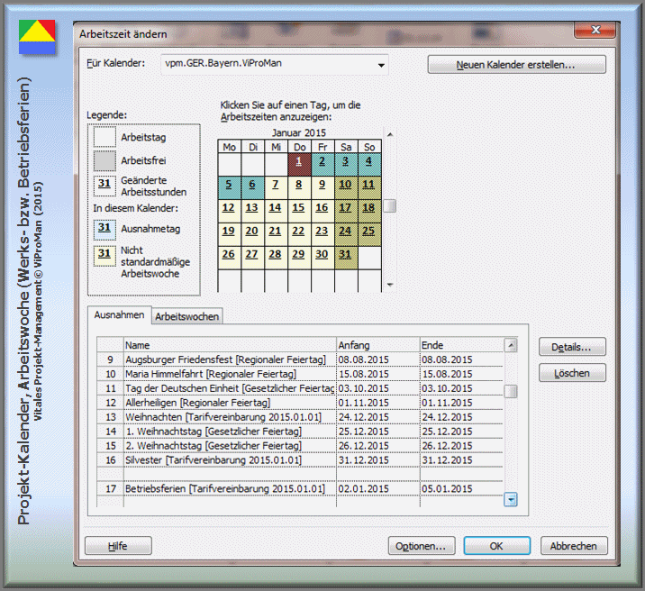 Abbildung: Projekt-Kalender vpm.GER.Bayern.ViProMan mit festgelegten Betriebsferien, beispielhaft für den Monat Januar in 2015 [ViProMan, 02.2015]
