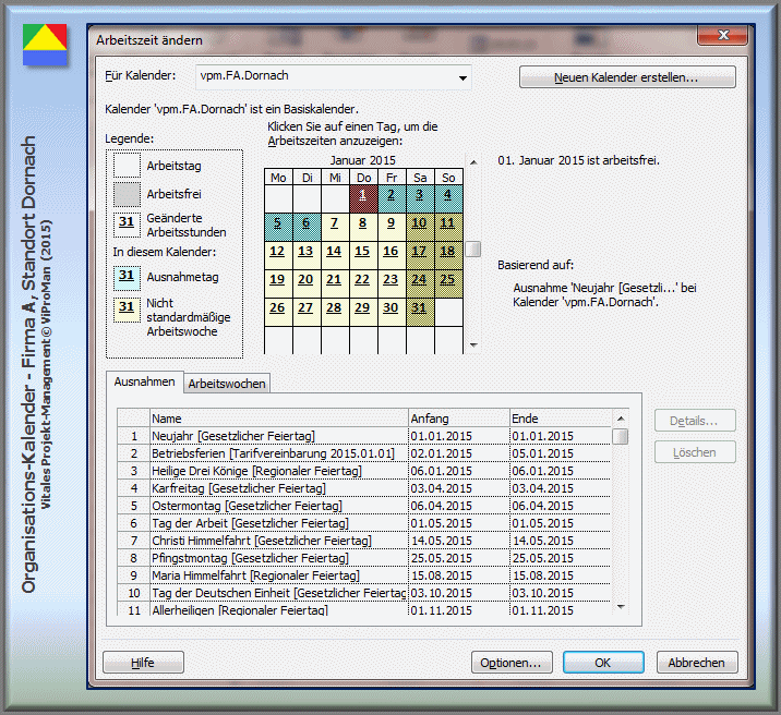 Das folgende Beispiel zeigt einen möglichen Organisations-Kalender der Firma A an Standort Dornach im Bundesland Bayern (Deutschland):