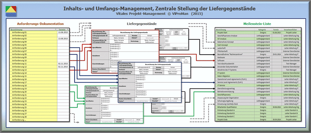 Abbildung: Zentrale Stellung der Liefergegenstände gegenüber der Anforderungs-Dokumentation und der Meilenstein-Liste [ViProMan, 10.2015]