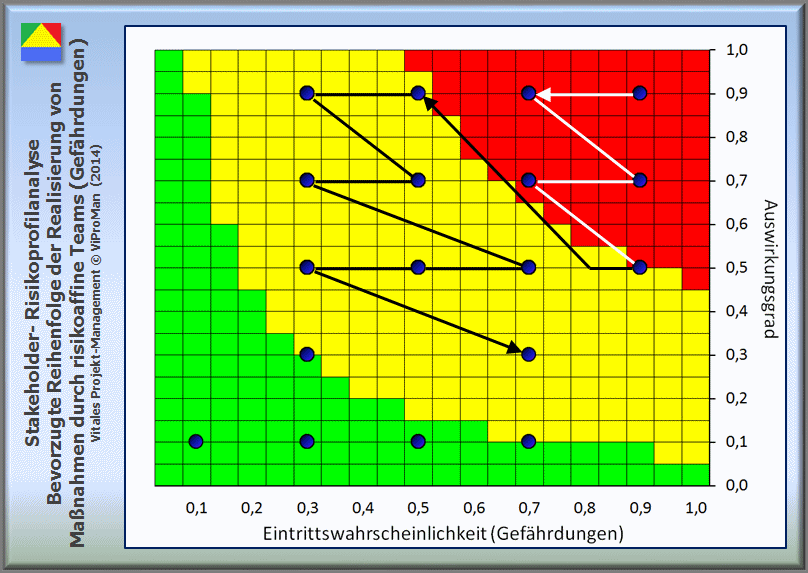 Abbildung: Erwartete Bearbeitungsreihenfolge der identifizierten als auch qualifizierten Risiken durch risikoaffine Projekt-Teams (Gefährdungen, 1. Näherung) [ViProMan, 07.2014]