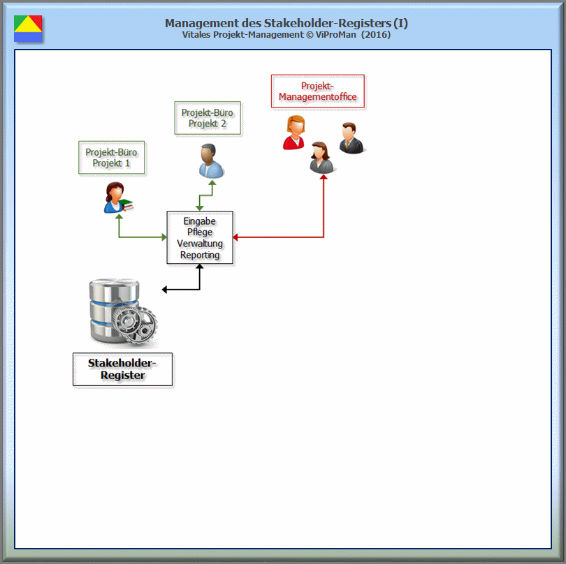 Die folgende Abbildung zeigt in einer schematischen Darstellung die zentrale Anordnung des Stakeholder-Registers sowie die den Vorgaben entsprechend geregelte Eingabe, Pflege und Verwaltung der in dem Register enthaltenen Informationen.