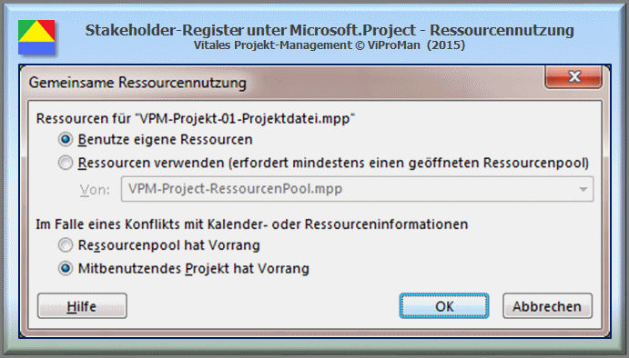 | Wählen Sie in der mitbenutzenden Project-Datei VPM-Projekt-01-Projektdatei.mpp in dem Register Ressourcen den Menüpunkt Ressourcenpool\Gemeinsame Ressourcennutzung und markieren Sie die Option ... | ||