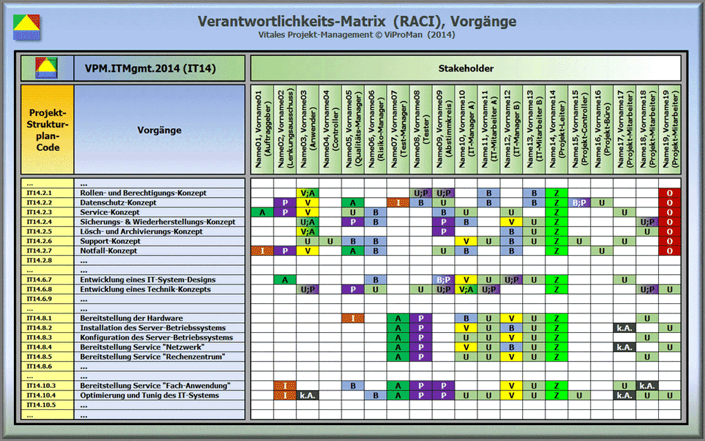 Abbildung: Beispielhafter Ausschnitt einer Verantwortlichkeits-Matrix für die Projekt-Komponente "Vorgänge" [ViProMan, 09.2014] (Beitrag öffnen)