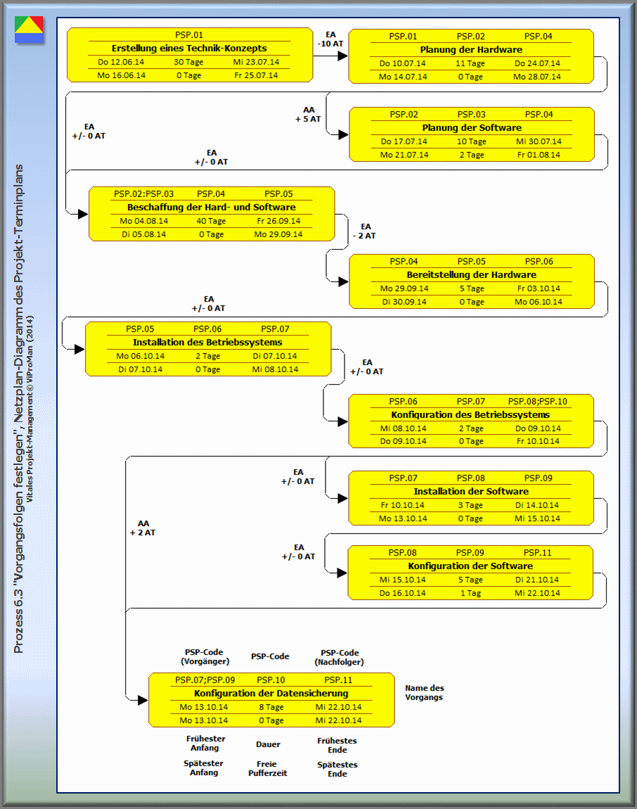 Abbildung: Beispielhaftes Erscheinungsbild eines Vorgangsknoten-Netzplans (2. Näherung) des Projekt-Terminplans [ViProMan, 10.2014]