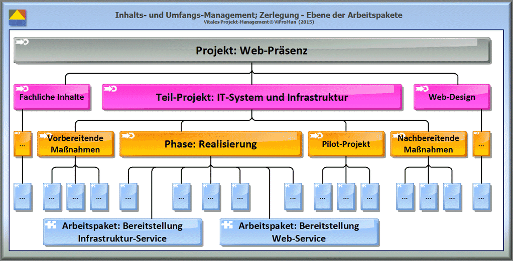 Abbildung: Darstellung der Zerlegungsstufe 3: Arbeitspaket-Ebene. Die Arbeitspakete der anderen Projekt-Phasen werden an dieser Stelle nicht explizit betrachtet. [ViProMan, 05.2015]
