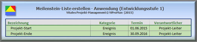 Unter Berücksichtigung der genannten Einschränkungen ergibt sich für die Meilenstein-Liste in dieser ersten Entwicklungsstufe des Anwendungsbeispiels das folgende Erscheinungsbild: