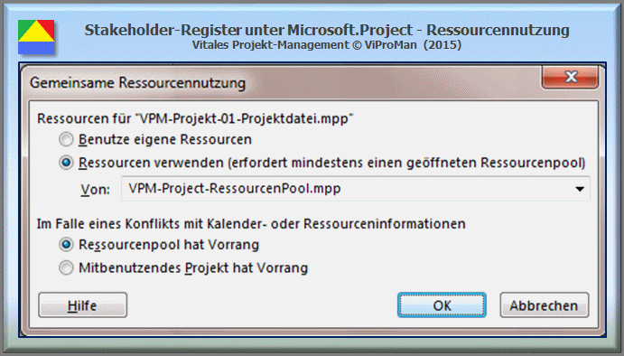 Bei der Nutzung eines zentralen Ressourcen-Pools ist zu berücksichtigen, dass eine einzelne Projekt-Datei immer nur mit einer einzigen Project-Ressourcendatei verbunden werden kann.